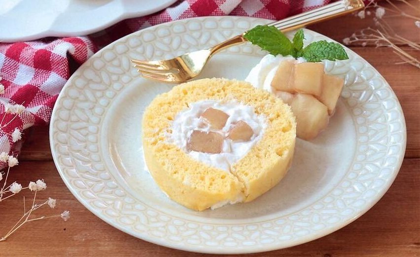 - 残りの生クリームや桃をロールケーキに飾り付け、お好みでミントを散らす。
